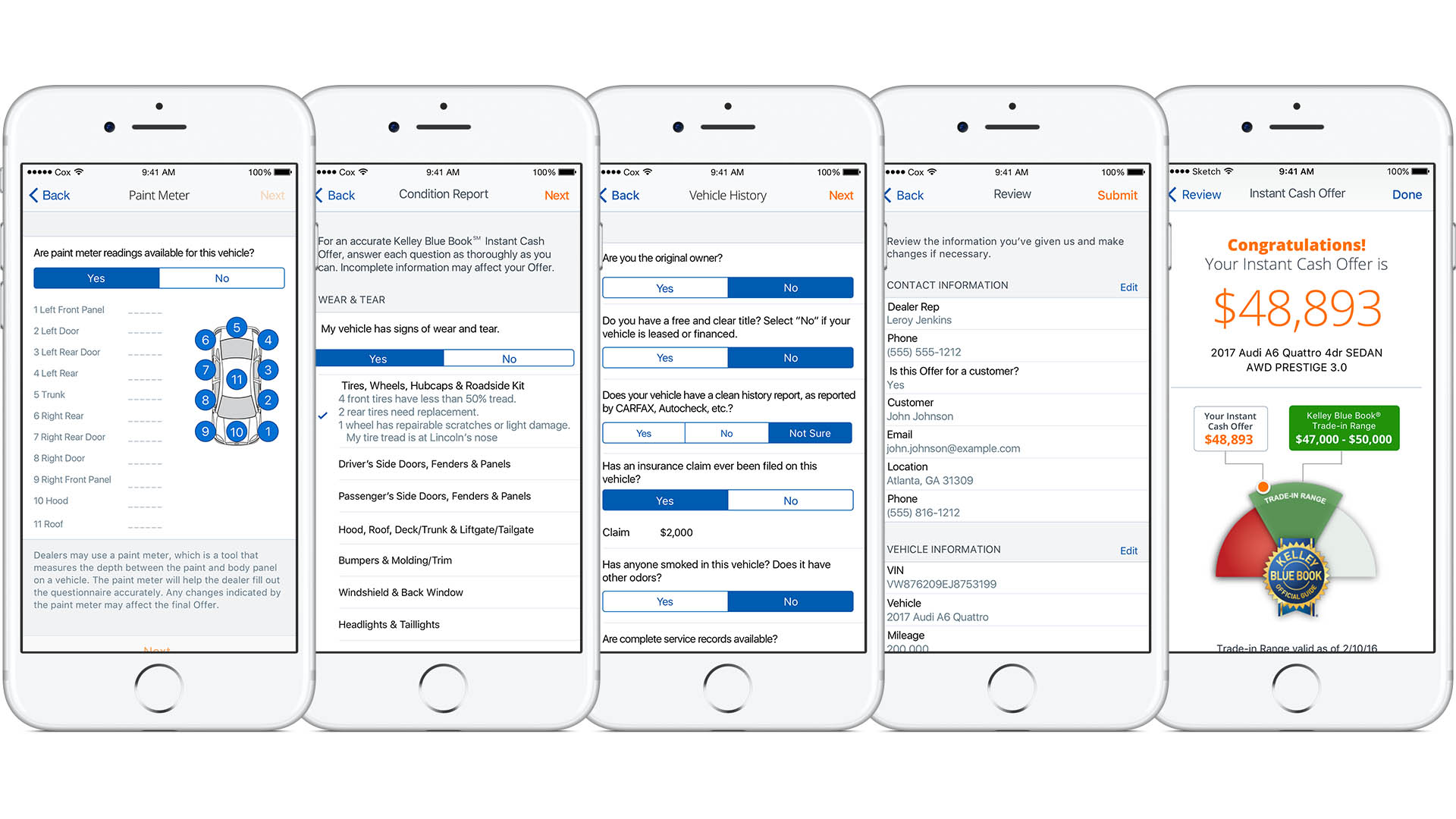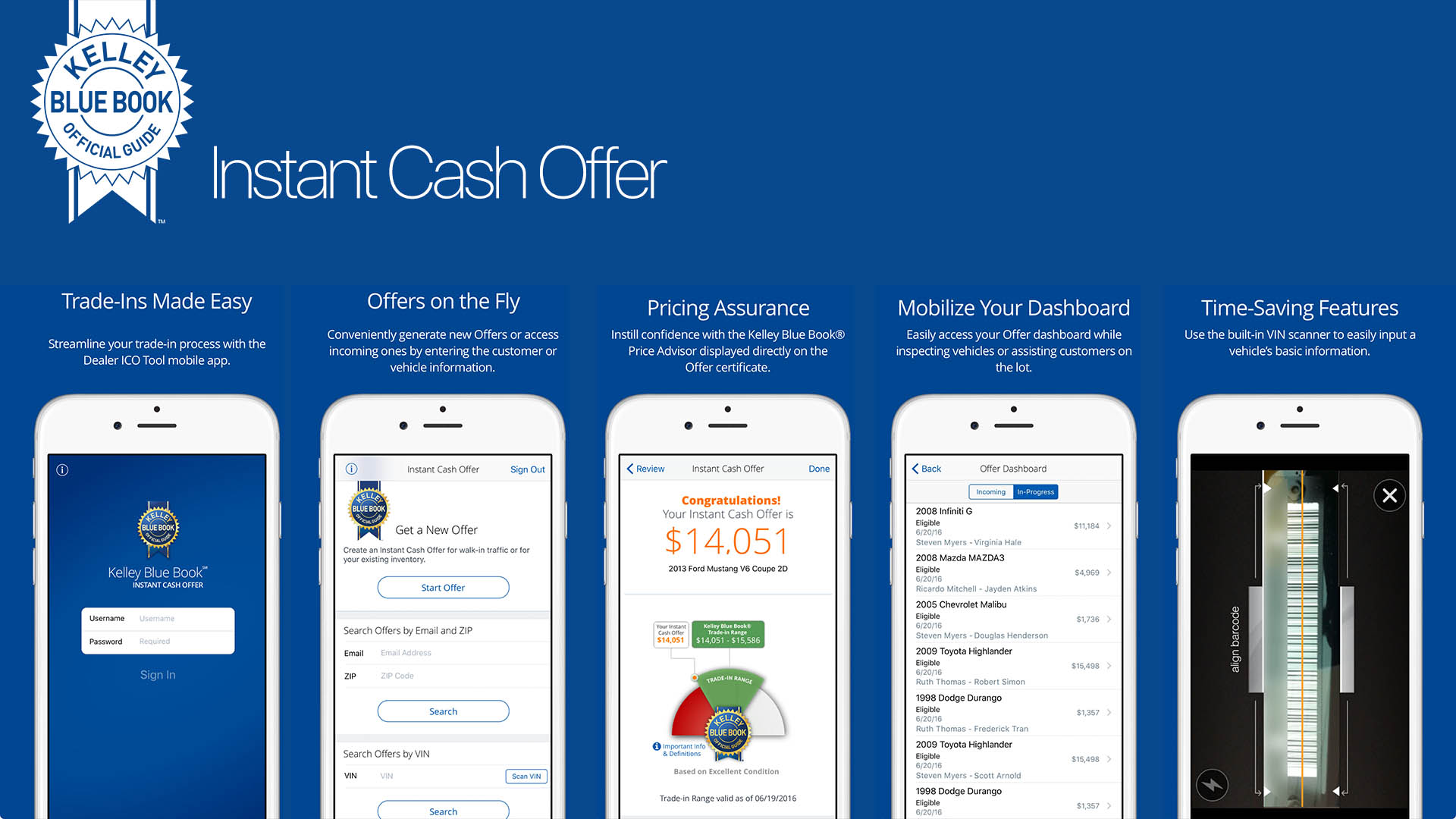 This app allows Participating Dealers to generate new and review existing Kelley Blue Book(SM) Instant Cash Offers. Participating Dealers can use this tool to conveniently generate and edit Offers for walk-in traffic and for existing inventory. Scan or enter the vehicle’s VIN and input its options and condition to generate an Instant Cash Offer. Once you have verified the car’s options and condition, the customer can sell their car to you or use the Offer toward the purchase of a new vehicle.