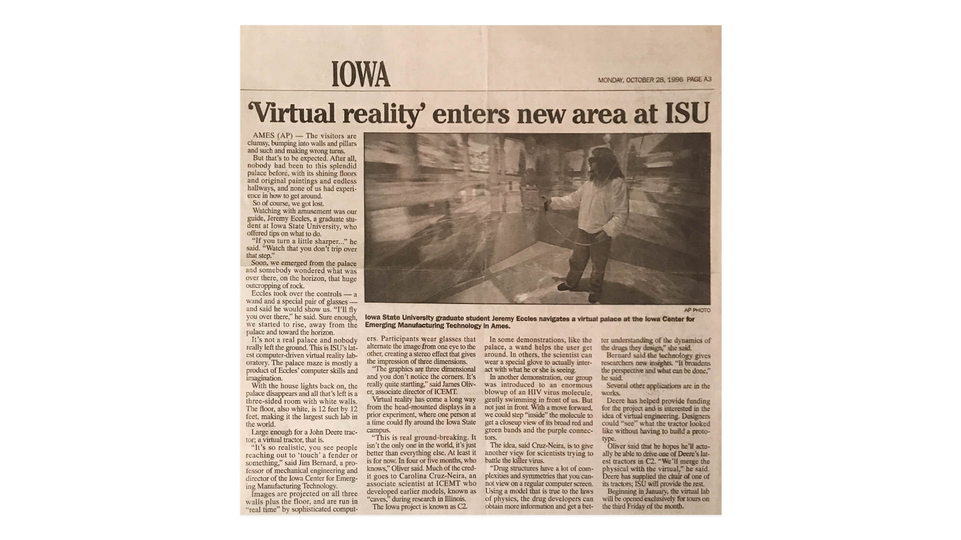Virtual worlds, location-based entertainment, architectural visualization, interactive design, and virtual storytelling. These are projects from my time as a virtual reality researcher at the Fraunhofer Institute for Media Communication (formerly GMD) and Iowa State University's Virtual Reality Application Center (VRAC). Industry partners and clients included Siemens AG, GlaxoSmithKlein plc. (GSK), Kunstmuseum Bonn, Beethoven-Haus Museum Bonn, Joschka Fischer, André Heller, ERCOM, Beat Zoderer, Vertigo Systems GmbH, and RMH New Media GmbH.